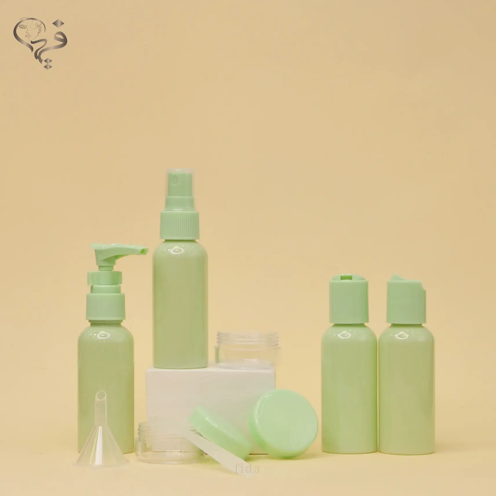 شامل 2 عدد بطری، 1 عدد اسپری، 1 عدد ظرف پمپی، دو عدد ظرف کوچک، قاشقک، قیف (کیف فانتزی)
